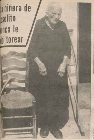 Dolores Miranda. la "tata " de Joselito se queda en Gelves. Allí nació y allí vive. EI recuerdo de sus años junto al gran torero sevillano, creo que la mantiene aún viva a sus 91 años. Ella; esta mujer anciana. es todo corazón. Y las lágrimas han brotado en los ojos de Dolores porque tiene aún presente aquellas jornadas de los primeros pasos de José Gómez 'Gallito '.